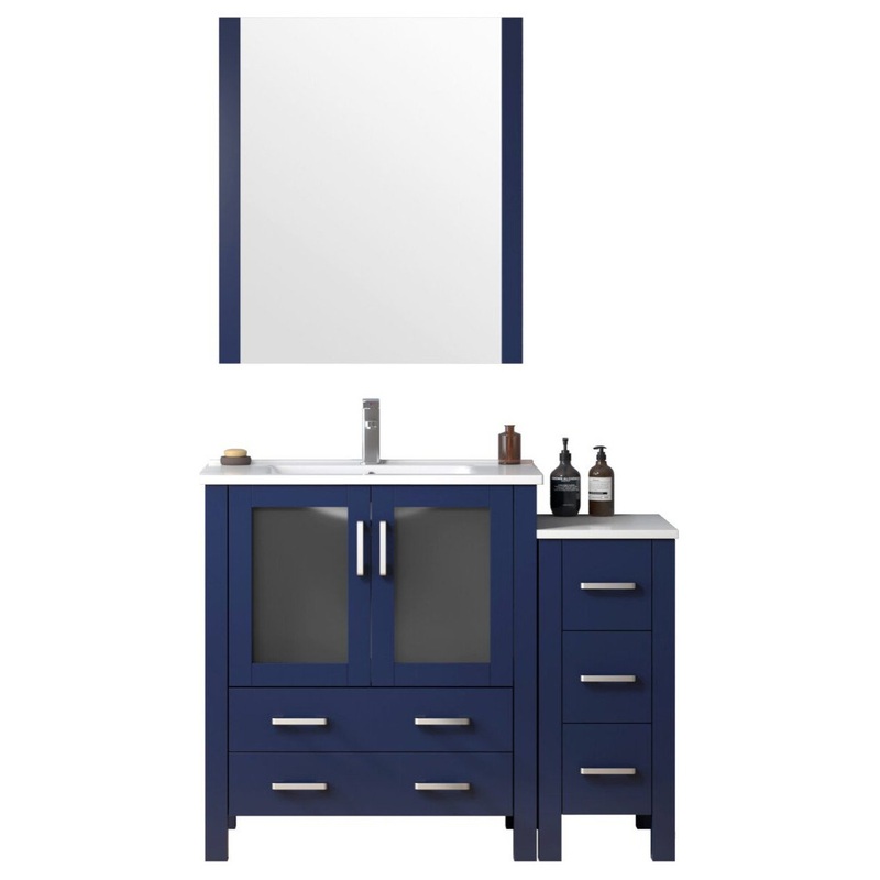 The Volez collection of modular bathroom cabinets is characterized by a functional and highly elegant design, with a compact size that fits in smaller bathroom spaces while adding a minimalist mid-century touch to your decor. With a practical and easy to install single hole faucet spread, an integrated ceramic top and heavy duty construction for excellent durability, this single vanity for bathroom includes 2 drawers and double cabinet doors for open storage space, fitting beauty & personal care essentials. Available in white, dark grey and navy blue, with raised legs and chrome hardware, this bathroom vanity cabinet is an excellent choice for half bathrooms as well as master bathrooms, creating a beautiful focal point that doesnt overpower the room.