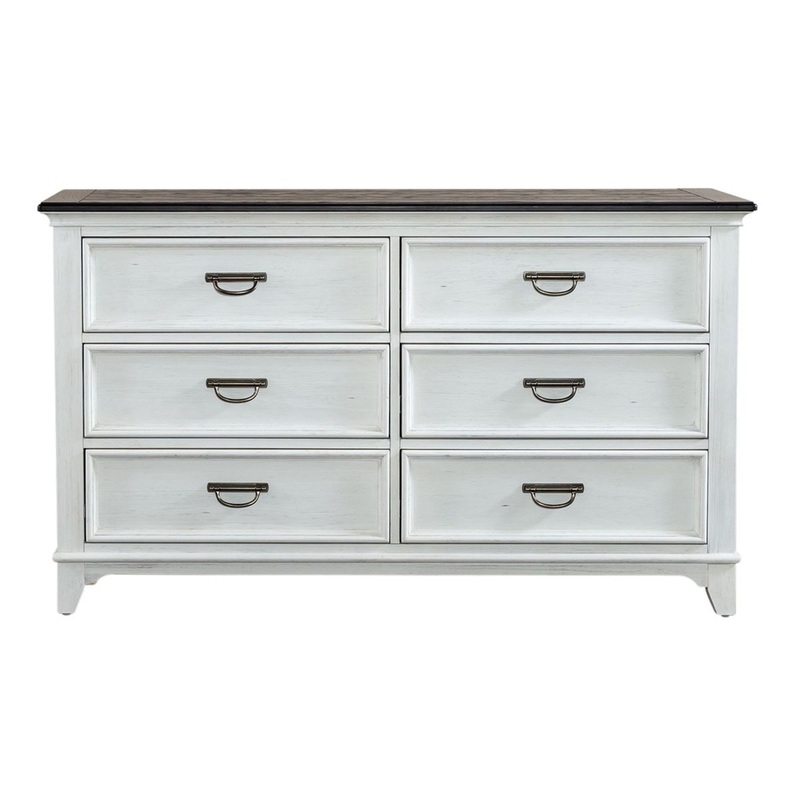 Liberty Furniture Allyson Park Drawer Dresser in White 417-BR30. Create a classic cottage style with 6 drawer dresser. The two-toned wire brushed white finish with charcoal top adds a taste of vintage, allowing this piece to work from the mountains to an industrial loft. The charcoal top is accented by planks while the white base is highlighted by bead molding and antique pewter hardware. Crafted of rubberwood solids with cathedral white oak tops, this piece features fully stained interior drawers, full extension drawer glides for easy access to storage, felt lined top drawers, and is anchored by tapered feet. Style uncompromised with storage abound, enjoy the ample drawer storage, each equipped with bottom case dust proofing.