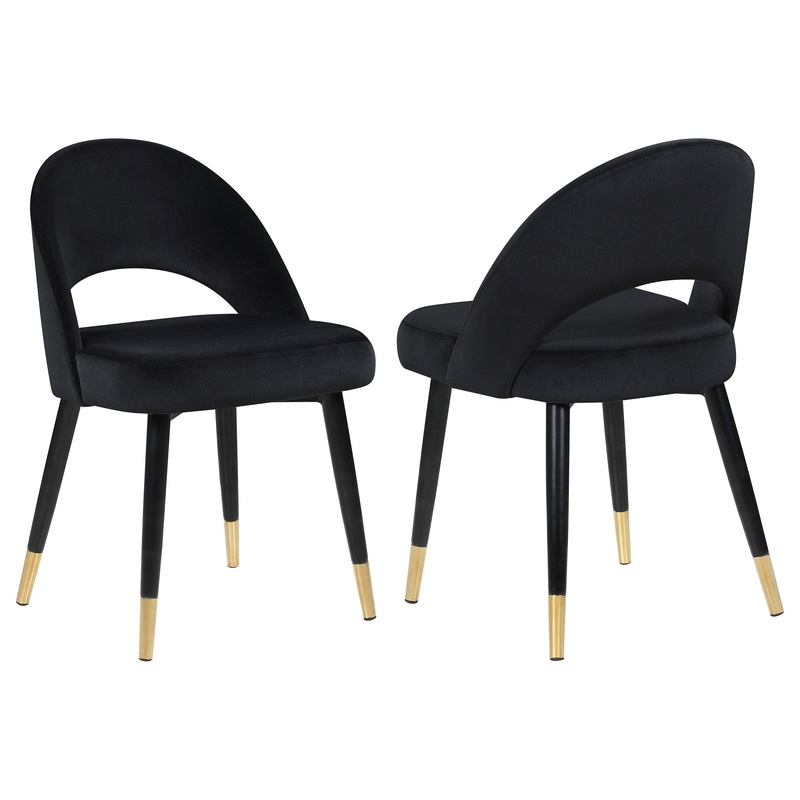 This set of two dining chairs features an elegant bucket style seat that lends a retro-inspired mid-century modern look. Each chair offers long-lasting, supportive seats for each dinner guest, wrapped in velvet upholstery that complements numerous color palettes and adds a bold statement piece. Flared, tapered legs further lend to the vintage flair. Gold capped feet offers a dramatic, regal Hollywood glam touch. Pull these chairs up to a spacious rectangular dining table to host a formal dinner or cocktail night.
