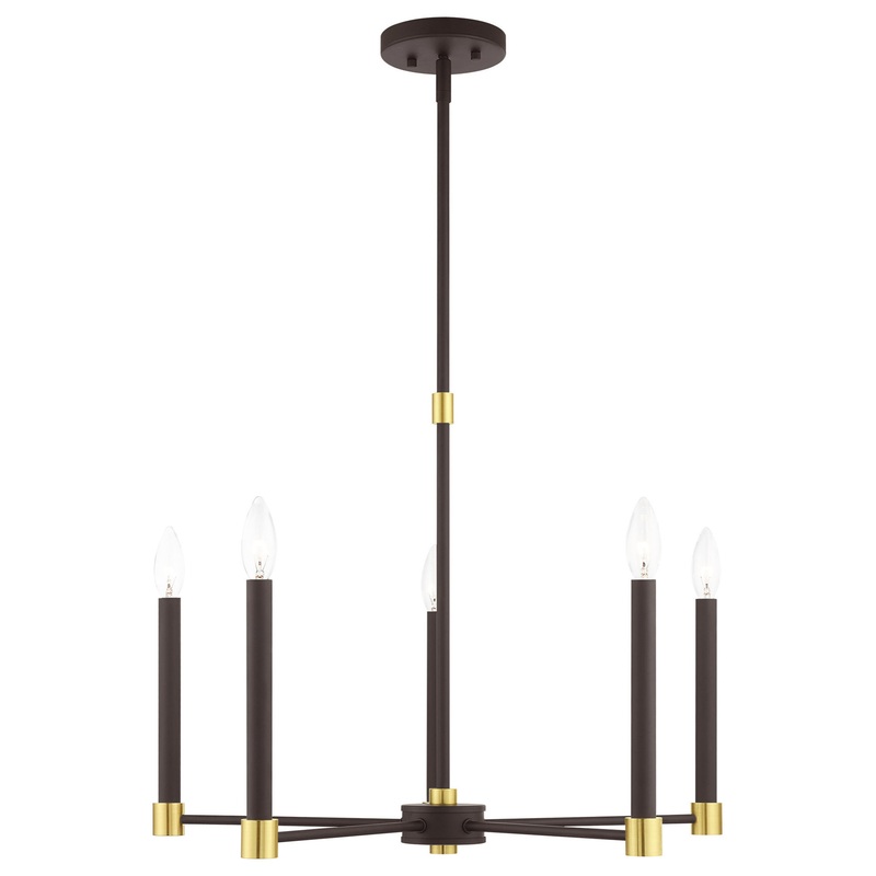 Simplicity and attention to detail are the key elements of the Karlstad collection. The dimensional form, exposed bulbs and two-tone finishes add a playful mood to a contemporary or urban interior. This five-light chandelier design gives a new face to a kitchen, bedroom or a bathroom vanity. It is shown in a bronze finish with satin brass finish accents.