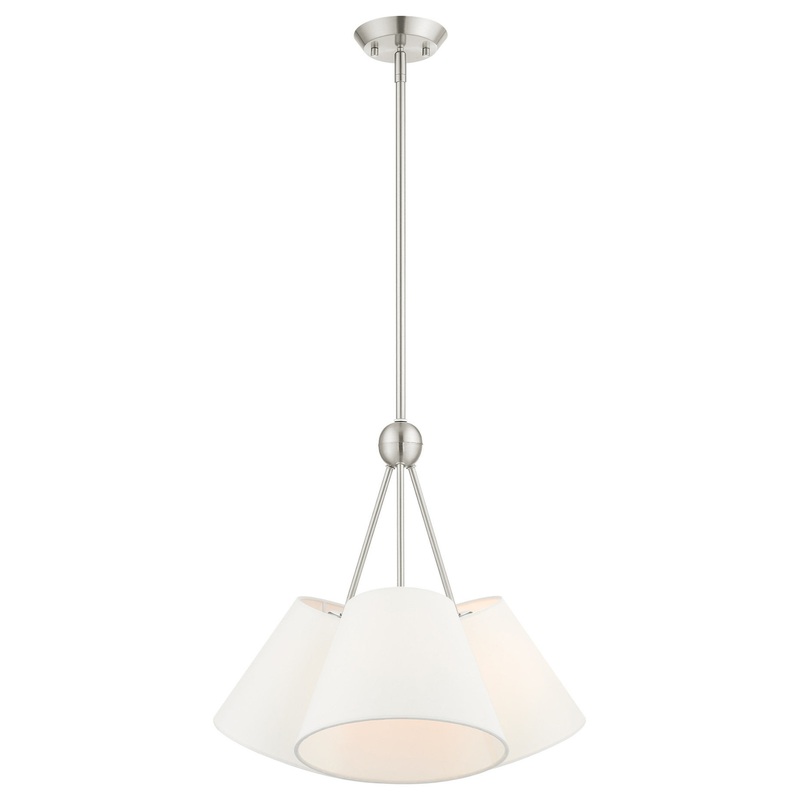 The Prato collection is both modern and versatile. The hand-crafted off-white colored fabric hardback shade sets a pleasant and current mood. The three-light shade cluster add character to this handsomely styled pendant. Perfect fit for the living room, dining room, kitchen and bedroom. This sleek design is shown in a brushed nickel finish.