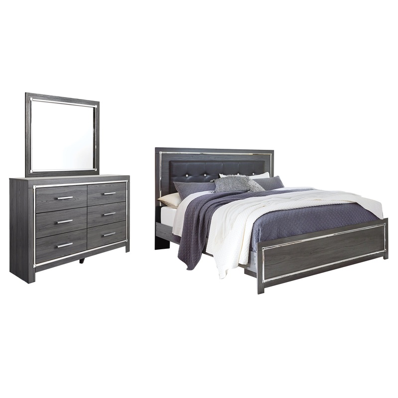 Reminiscent of Hollywood glamour of yesteryear, this bedroom set with king bed and dresser/mirror interprets luxury in a decidedly modern way. Headboard details include button-tufted upholstery, faceted faux crystals and LED lights enhanced with remote-controlled settings for color and brightness. Chrome-tone drawer pulls and accents are a chic complement to the dazzling gray finish.