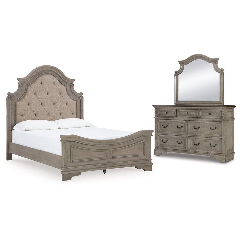Cottage quaint styling and quality construction make this bedroom package a dream come true. A two-tone finish provides natural warmth, with an antiqued gray body and a rich, deep walnut on top. Framed drawer fronts and dark bronze-tone hardware marry clas