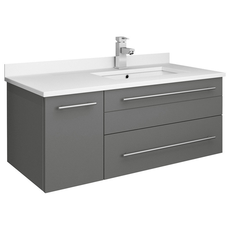 Classically simple with clean lines and a contoured undermount sink, this Fresca Lucera Wall Hung Modern Bathroom Cabinet will bring out the best in any bathroom. Measuring 36″ in width, this sophisticated cabinet has a well constructed solid wood frame with a roomy right-side compartment for holding bathroom essentials and a spacious drawer with a decorative beveled drawer plate design. The door and drawer are soft-closing and feature slim brushed metal handles. This modern cabinet has a chic painted Gray finish. Gracing the top of the cabinet is a striking quartz stone countertop with backsplash and a white ceramic undermount sink which adds to its clean aesthetic. The sink is equipped with an integrated overflow and single hole faucet mount, ready for the faucet of your choice (sold separately).