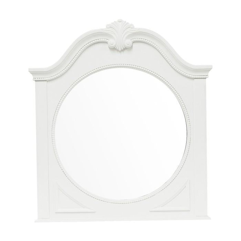 Classic traditional styling creates an elegant addition to your home in the Lucida Collection. Bead molding, shell motif and traditional framing provide classic accent to the round mirror. Coordinating twin and full-size beds, dresser, chest and nightstand