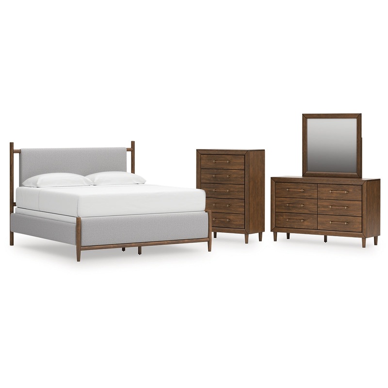 This bedroom package is perfect for contemporary or mid-century interiors. Its wood-tone finish is both versatile and timeless. When its time for a bedroom refresh, this set is the ideal choice.SpecificationsDetailsB615B6: Includes upholstered panel headbo