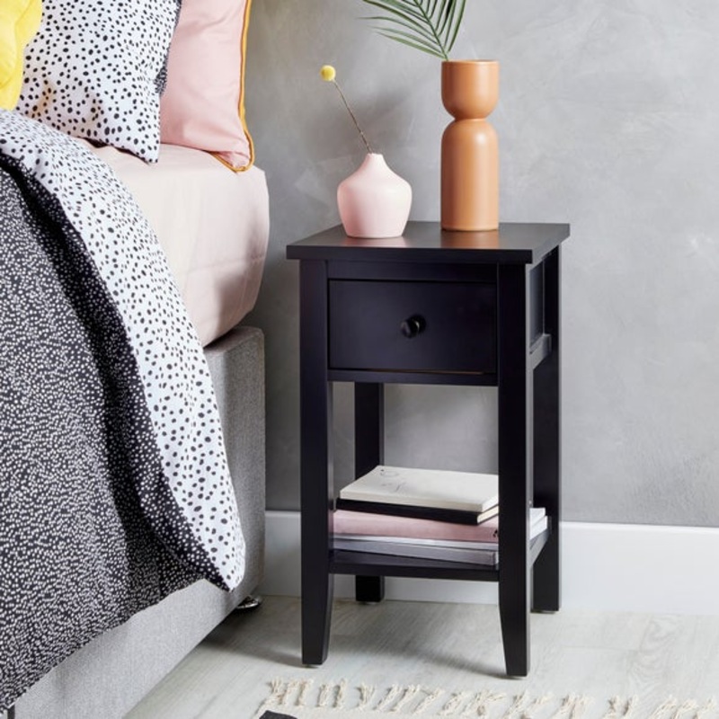 Dunelm Exclusive - Designed and Developed by DunelmPainted finishCompact, slimline sizeBlack metal handlePerfect as a bedside table or side table in the living room, hallway, or office, the Lynton will suit any space in your home! The slim, compact design