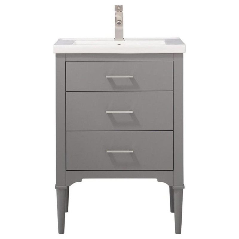 The Maklaine 24 inch single sink vanity by Design Element provides the perfect finishing touch to your bathroom remodel project. Featuring a solid hardwood frame, this vanity will maintain its beauty and functionality year after year. The porcelain countertop and integrated sink with overflow perfectly matches the styling of the cabinet, and is extremely simple to maintain. Each of the 2 fully functional drawers are constructed with dovetail joints and soft close glides. The included brushed nickel hardware perfectly compliments the gray cabinet. Faucet and drain are not included.