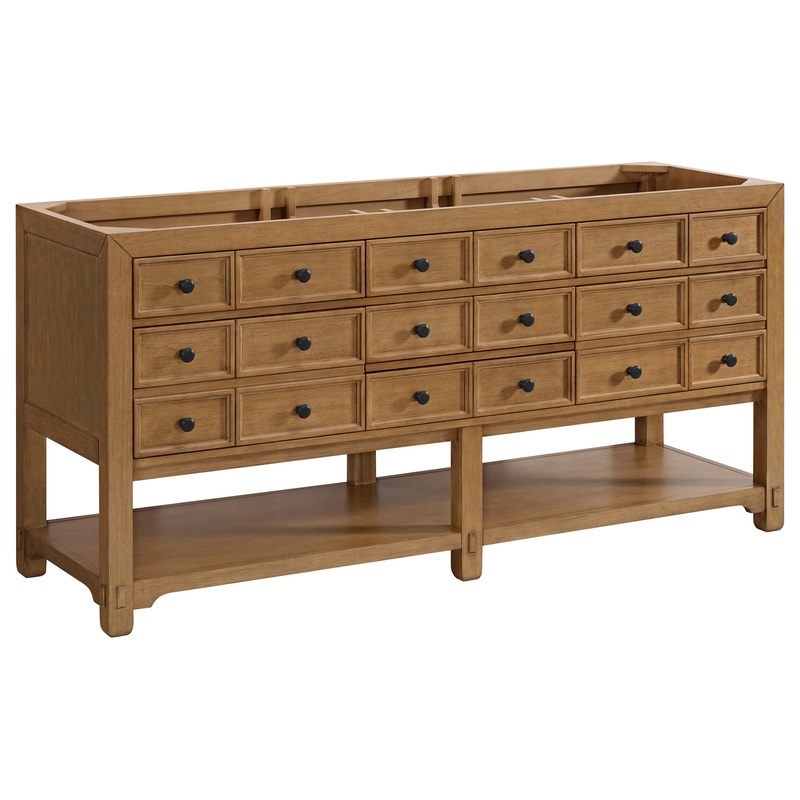 The Malibu 72" Double Vanity by James Martin Vanities features a warm Amber Birch finish and contemporary Matte Black hardware. Made from solid poplar with birch veneers, this vanity features five drawers (two are double-height), two top-row tip-out drawer