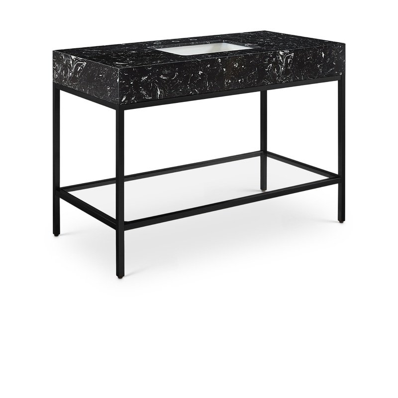 Give your bathroom a fresh new look with this Marmo 48-inch bathroom vanity. This eye-grabbing vanity gives your restroom a spa vibe that’s oozing contemporary charm and sophistication. The black engineered stone sink features white veining for an upscale presentation and rests on a matte black-finish stainless steel base for long-lasting beauty and performance. Ceramic construction ensures durability, so you can count on this 48-inch sink lasting for the long haul.