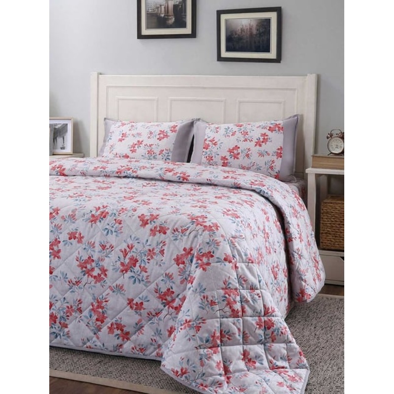 A reversible quilt that can be used from both sides, 100 percent cotton outside and inside is 100 percent polyester filling, the quilt is ideal to use for all-year-round seasons, the filling is wadded using non-woven fabric, ensuring that fiber does not shift or accumulate after multiple washes, skin friendly product, extremely cozy, it looks as good as new for a longer time.