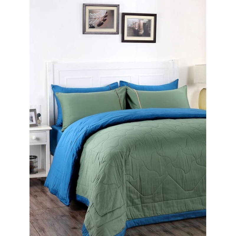 Enliven your bedroom with this green and blue bed linen set from Maspar. Crafted with care using superior quality cotton with a fabric quality of 120 TC, it gives a soft feel. This quilt with a stitched pattern will create a zestful aura in your room. The high-quality fillers are sure to surround you with a warm embrace and are safely ensconced in quality cover that gently yields to your touch. It brings to you warmth, joy and luxury. The set contains 1 double quilt, 1 king bed sheet with 2 pillow covers.