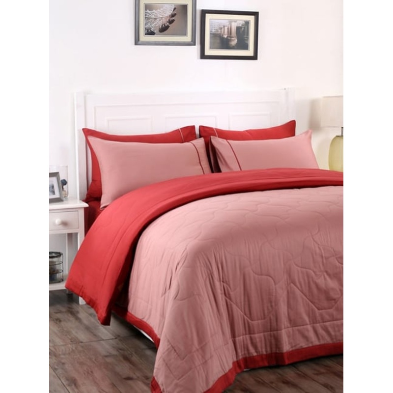 Enliven your bedroom with these red bed linen set from Maspar. Crafted with care using superior quality cotton with a fabric quality of 120 TC, the set gives a soft feel. These quilts with a stitched pattern will create a zestful aura in your room. The high-quality fillers are sure to surround you with a warm embrace and are safely ensconced in quality cover that gently yields to your touch. The set brings to you warmth, joy and luxury. The set contains 1 double quilt, 1 king bed sheet with 2 pillow covers.