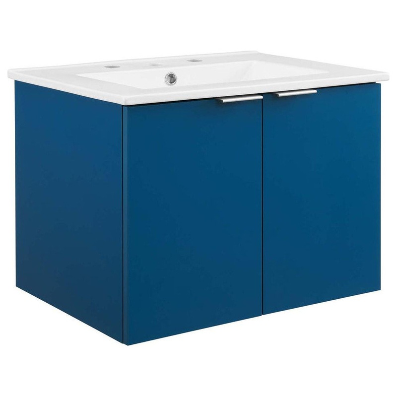 Incorporate modern aesthetics and contemporary style into your bathroom decor with the Maybelle 24 Bathroom Vanity. This vanity features a durable melamine construction with ample storage space for all your bathroom essentials behind two soft-close hinge doors with metal L-shaped handle pulls. Continuing the look of this modern vanity is a ceramic sink with an integrated countertop and 8 centerset faucet holes. Mounting directly to the wall, this bathroom sink vanity saves a substantial amount of floor space. Assembly required. Sink fixtures not included.