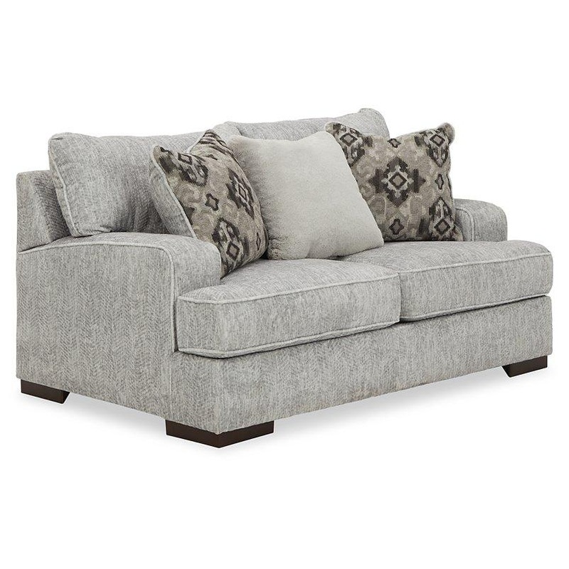 An indulgent choice with deep seats crafted for ultra-plush softness, this loveseat is the ideal merger of modern flair and classic staying power. If you love a touch of texture, youre sure to appreciate this loveseats gorgeous gray upholstery with subtle chevron effect. Posh toss pillows layered over the loose back cushions perfect the richly relaxed aesthetic.