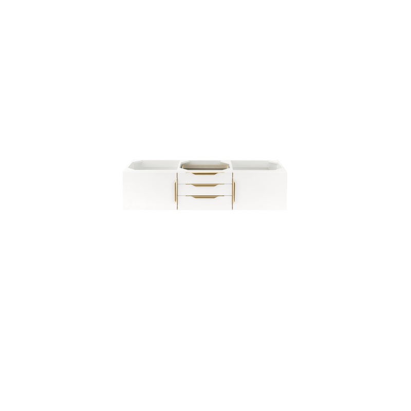 The Mercer Island 59″ Glossy White vanity offers maximum storage with two soft-closing doors, three soft-closing drawers, and lower shelf space. This cabinet comes with premium features such as one solid bamboo in-drawer organizer and one 120 Volt UL rated electrical component with two electrical and two USB (2.0) outlets. Cabinet includes Radiant Gold door and drawer pulls. This wall mounted vanity comes with heavy duty mounting brackets to create a modern look.