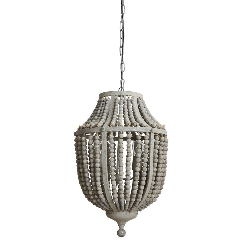 Add some style and grace to the space with this draped wood bead chandelier. This chandelier showcases a sleek metal frame that supports two lights and draped grey wood beads. The wood beads create a stunning contrast with the metal and cast a beautiful gl