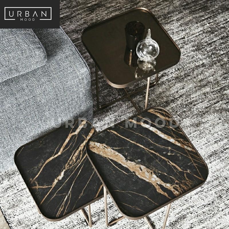 Dimensions (cm): 36L x 36W x 33H 36L x 36W x 43H 36L x 36W x 53HColours: White marble Grey marble Black marble Materials: Engineered marble Powdercoated iron Interior themes: Modern/Contemporary Minimalist Classic Luxury Industrial Eclectic Bohemian Hotel