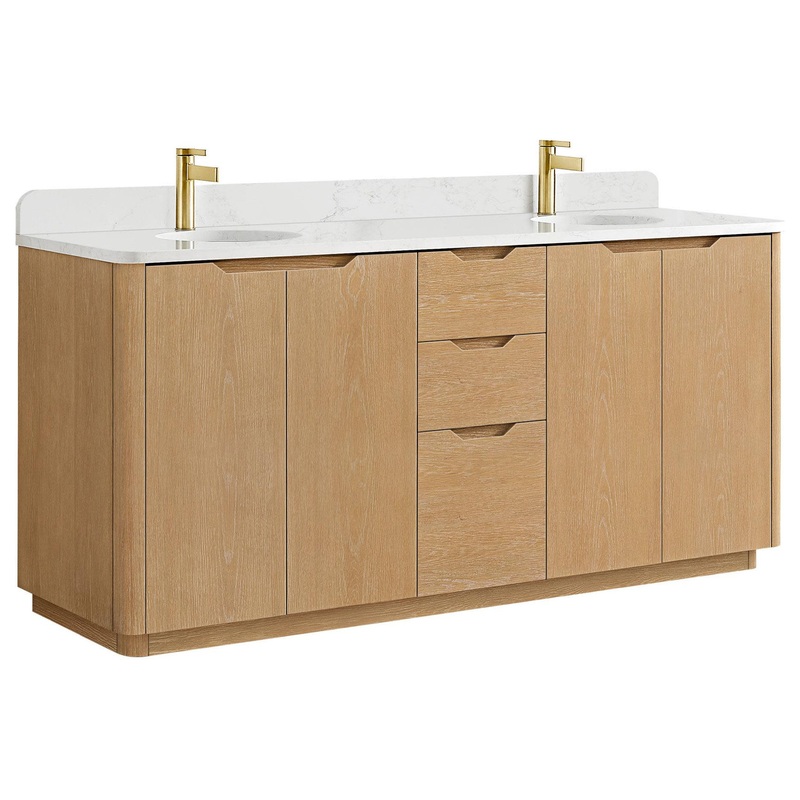 The exquisite Abuja vanity series is made from premium, imported solid wood, bringing natural elegance, supreme durability, and everyday practicality to your bathroom space. It boasts a luxurious composite stone top with round undermount sink that is both stain and scratch resistant, ensuring long-lasting beauty and easy maintenance. Designed with convenience in mind, this spacious, storage-rich vanity includes built-in power and USB outlets for seamless integration of your grooming tools and devices. Included Components: Covered under a manufacturer’s 1 year limited warranty Wood vanity cabinet with 4 doors, 3 drawers, and 2 shelves Stone composite vanity top with two ceramic sinks and matching backsplash Faucet is not included and must be purchased separately Built-in UL-listed power and USB outlets offer a practical way to power beauty and grooming appliances Cabinet Features: Constructed from wood providing a lifetime of durability Free standing installation – vanity is seated on the floor with wall anchors, providing a functional design 4 door design provides easy access to storage space 3 full extension drawers with soft-close slides allow for organized storage Soft close drawer slides operate on smooth ball-bearings and prevent drawers from slamming shut Anti-collision, integrated drawer handles provide a seamless look and are ergonomically designed for your comfort Vanity will ship fully assembled Vanity Top Features: Stone composite vanity top includes 2 undermount sinks constructed of ceramic High-gloss, anti-fouling coating makes the vanity top scratch-resistant, wear-resistant, and easy to clean Single pre-drilled faucet hole per basin Each sink features its own circular single basin workspace Center drain location provides optimal draining capability Equipped with an overflow drain to help prevent spillage Vanity top includes matching backsplash Cabinet Specifications: Cabinet Width: 71-3/16″ (left to right) Cabinet Height: 32-7/8″ (top to bottom) Cabinet Depth: 21-5/8″ (front to back) Number of Doors: 4 Number of Drawers: 3 Number of Shelves: 2 Vanity Top Specifications: Vanity Top Width: 72″ (left edge to right edge) Vanity Top Depth: 22″ (front edge to back edge) Backsplash Height: 3-7/8″ Number of Basins: 2 Sink Basin Dimensions: 13-3/4″ L x 13-3/4″ W x 6-11/16″ D Number of Faucet Holes: 1 Faucet Centers: 0″ (distance between the installation holes for the faucet handles)