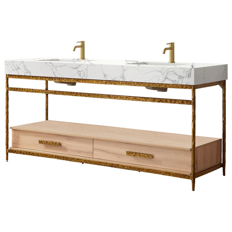 Introducing the Dhaka series vanitythe perfect way to infuse your guest or master bath with distinctive contemporary style. Thoughtfully engineered with environment-friendly technology moisture-proof board and solid metal, this visually striking vanity blends a variety of textures and finishes to instantly lend aesthetic richness to your space. The exquisite marbled composite countertop adds a touch of opulence, while the specially coated sink resists daily wear and tear to maintain its sheen over time. Included Components: Covered under a manufacturer’s 1 year limited warranty Stainless steel and wood vanity cabinet with 2 drawers and 1 shelf Stone composite vanity top with two ceramic sinks Faucet is not included and must be purchased separately Cabinet Features: Constructed from stainless steel and wood providing a lifetime of durability Free standing installation – vanity is seated on the floor with wall anchors, providing a functional design 2 full extension drawers with soft-close slides allow for organized storage Soft close drawer slides operate on smooth ball-bearings and prevent drawers from slamming shut Vanity cabinet includes matching decorative hardware Vanity will ship fully assembled Vanity Top Features: Stone composite vanity top includes 2 undermount sinks constructed of ceramic High-gloss, anti-fouling coating makes the vanity top scratch-resistant, wear-resistant, and easy to clean Single pre-drilled faucet hole per basin Each sink features its own rectangular single basin workspace Center drain location provides optimal draining capability Equipped with an overflow drain to help prevent spillage Cabinet Specifications: Cabinet Width: 71-3/4″ (left to right) Cabinet Height: 29-1/8″ (top to bottom) Cabinet Depth: 21-3/4″ (front to back) Number of Drawers: 2 Number of Shelves: 1 Vanity Top Specifications: Vanity Top Width: 72″ (left edge to right edge) Vanity Top Depth: 22″ (front edge to back edge) Number of Basins: 2 Sink Basin Dimensions: 18-1/2″ L x 12-3/8″ W x 8-1/4″ D Number of Faucet Holes: 1 Faucet Centers: 0″ (distance between the installation holes for the faucet handles)