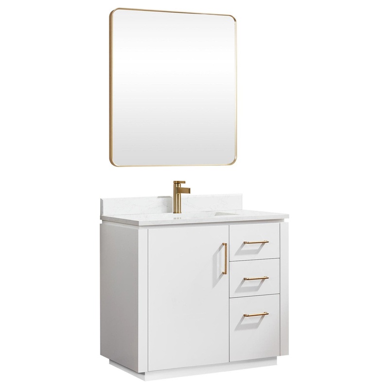 The exquisite San series vanity is expertly crafted from premium hardwood, ensuring exceptional durability and a timeless aesthetic that never goes out of style. The natural grain of the wood adds warmth, texture, and character to your bathroom space, creating a seamless fusion of modern and classic design elements. Soft-closing drawers and cabinets provide you with easy, organized access to all your essentials. Included Components: Covered under a manufacturer’s 1 year limited warranty Wood vanity cabinet with 1 door, 3 drawers, and 1 shelf Stone composite vanity top with a single ceramic sink and matching backsplash Faucet is not included and must be purchased separately 36″ H x 32″ W rectangular framed mirror Built-in UL-listed power and USB outlets offer a practical way to power beauty and grooming appliances Cabinet Features: Constructed from wood providing a lifetime of durability Free standing installation – vanity is seated on the floor with wall anchors, providing a functional design Single door design provides easy access to storage space 3 full extension drawers with soft-close slides allow for organized storage Soft close drawer slides operate on smooth ball-bearings and prevent drawers from slamming shut Vanity cabinet includes matching decorative hardware Vanity will ship fully assembled Vanity Top Features: Stone composite vanity top includes an undermount sink constructed of ceramic High-gloss, anti-fouling coating makes the vanity top scratch-resistant, wear-resistant, and easy to clean Single pre-drilled faucet hole Each sink features its own rectangular single basin workspace Center drain location provides optimal draining capability Equipped with an overflow drain to help prevent spillage Vanity top includes matching backsplash Cabinet Specifications: Cabinet Width: 36″ (left to right) Cabinet Height: 32-7/8″ (top to bottom) Cabinet Depth: 21-13/16″ (front to back) Number of Doors: 1 Number of Drawers: 3 Number of Shelves: 1 Vanity Top Specifications: Vanity Top Width: 36″ (left edge to right edge) Vanity Top Depth: 22″ (front edge to back edge) Backsplash Height: 3-7/8″ Number of Basins: 1 Sink Basin Dimensions: 18-1/2″ L x 12-3/8″ W x 8-5/16″ D Number of Faucet Holes: 1 Faucet Centers: 0″ (distance between the installation holes for the faucet handles)