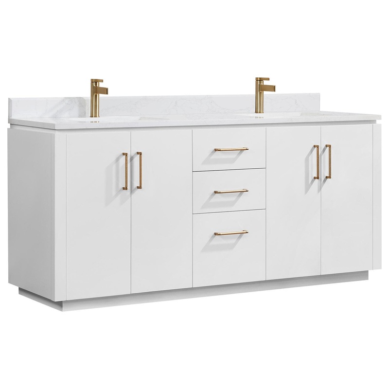 The exquisite San series vanity is expertly crafted from premium hardwood, ensuring exceptional durability and a timeless aesthetic that never goes out of style. The natural grain of the wood adds warmth, texture, and character to your bathroom space, creating a seamless fusion of modern and classic design elements. Soft-closing drawers and cabinets provide you with easy, organized access to all your essentials. Included Components: Covered under a manufacturer’s 1 year limited warranty Wood vanity cabinet with 4 doors, 3 drawers, and 2 shelves Stone composite vanity top with two ceramic sinks and matching backsplash Faucet is not included and must be purchased separately Built-in UL-listed power and USB outlets offer a practical way to power beauty and grooming appliances Cabinet Features: Constructed from wood providing a lifetime of durability Free standing installation – vanity is seated on the floor with wall anchors, providing a functional design 4 door design provides easy access to storage space 3 full extension drawers with soft-close slides allow for organized storage Soft close drawer slides operate on smooth ball-bearings and prevent drawers from slamming shut Vanity cabinet includes matching decorative hardware Vanity will ship fully assembled Vanity Top Features: Stone composite vanity top includes 2 undermount sinks constructed of ceramic High-gloss, anti-fouling coating makes the vanity top scratch-resistant, wear-resistant, and easy to clean Single pre-drilled faucet hole per basin Each sink features its own rectangular single basin workspace Center drain location provides optimal draining capability Equipped with an overflow drain to help prevent spillage Vanity top includes matching backsplash Cabinet Specifications: Cabinet Width: 72″ (left to right) Cabinet Height: 32-7/8″ (top to bottom) Cabinet Depth: 21-13/16″ (front to back) Number of Doors: 4 Number of Drawers: 3 Number of Shelves: 2 Vanity Top Specifications: Vanity Top Width: 72″ (left edge to right edge) Vanity Top Depth: 22″ (front edge to back edge) Backsplash Height: 3-7/8″ Number of Basins: 2 Sink Basin Dimensions: 18-1/2″ L x 12-3/8″ W x 8-5/16″ D Number of Faucet Holes: 1 Faucet Centers: 0″ (distance between the installation holes for the faucet handles)