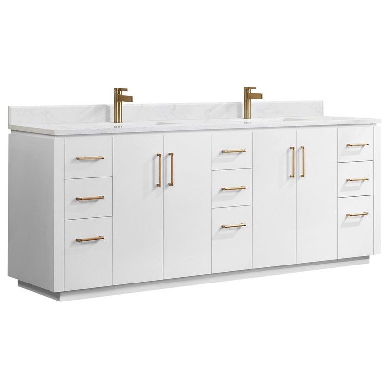 The exquisite San series vanity is expertly crafted from premium hardwood, ensuring exceptional durability and a timeless aesthetic that never goes out of style. The natural grain of the wood adds warmth, texture, and character to your bathroom space, creating a seamless fusion of modern and classic design elements. Soft-closing drawers and cabinets provide you with easy, organized access to all your essentials. Included Components: Covered under a manufacturer’s 1 year limited warranty Wood vanity cabinet with 4 doors, 8 drawers, and 2 shelves Stone composite vanity top with two ceramic sinks and matching backsplash Faucet is not included and must be purchased separately Built-in UL-listed power and USB outlets offer a practical way to power beauty and grooming appliances Cabinet Features: Constructed from wood providing a lifetime of durability Free standing installation – vanity is seated on the floor with wall anchors, providing a functional design 4 door design provides easy access to storage space 8 full extension drawers with soft-close slides allow for organized storage Soft close drawer slides operate on smooth ball-bearings and prevent drawers from slamming shut Vanity cabinet includes matching decorative hardware Vanity will ship fully assembled Vanity Top Features: Stone composite vanity top includes 2 undermount sinks constructed of ceramic High-gloss, anti-fouling coating makes the vanity top scratch-resistant, wear-resistant, and easy to clean Single pre-drilled faucet hole per basin Each sink features its own rectangular single basin workspace Center drain location provides optimal draining capability Equipped with an overflow drain to help prevent spillage Vanity top includes matching backsplash Cabinet Specifications: Cabinet Width: 84″ (left to right) Cabinet Height: 32-7/8″ (top to bottom) Cabinet Depth: 21-13/16″ (front to back) Number of Doors: 4 Number of Drawers: 8 Number of Shelves: 2 Vanity Top Specifications: Vanity Top Width: 84″ (left edge to right edge) Vanity Top Depth: 22″ (front edge to back edge) Backsplash Height: 3-7/8″ Number of Basins: 2 Sink Basin Dimensions: 18-1/2″ L x 12-3/8″ W x 8-5/16″ D Number of Faucet Holes: 1 Faucet Centers: 0″ (distance between the installation holes for the faucet handles)