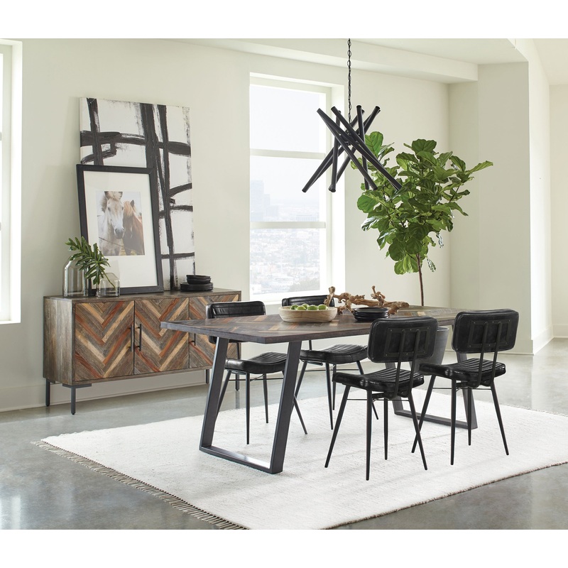 Retro charm is on full display in a dining ensemble that recreates a popular past era. Warm tones and a festive look indulge Mid-Century Modern attitude in this five-piece casual dining set. A rectangular wood and iron dining table anchors this stylish set