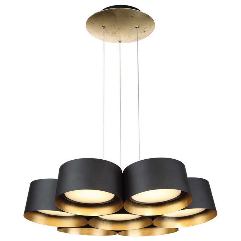 Percussion perfection. This extraordinary cluster of seven LED luminaires, each delivering generous diff used illumination, transforms into a state-of-the-art chandelier. Custom LED modules provide high quality lumens and dimming control. Hand finished with a stunning Dark Bronze and Gold Leaf or White and Silver Leaf.
