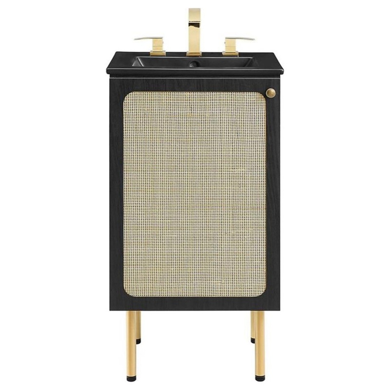 Refresh your washroom with the textured detail of the Chaucer 18″ Bathroom Vanity. Featuring beautiful rattan weaving on its door, this vanity cabinet instantly updates any bathroom or powder room. A spacious adjustable top shelf and a fixed bottom shelf hidden behind its hinged door offers ample storage space for toiletries, towels, and other bathroom essentials. Boasting a ceramic basin with 8″ centerset holes and an integrated countertop, this vanitys design highlights its sleek countertop for an added touch of elegance. Enriched by a stylish round metal cabinet knob and resting on sleek legs with adjustable feet for added stability, this bathroom cabinet is durably crafted with MDF, particleboard, and wood grain laminate to bring natural organic aesthetics to your decor. Assembly required. Fixtures not included.