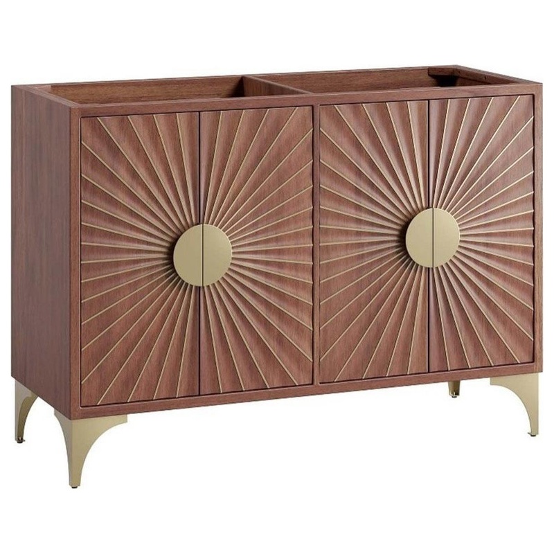 Bring refreshing energy into your bathroom space with the Daylight 48″ Bathroom Vanity Cabinet. Beautifully crafted with solid mango wood and a rich wood stain, this bathroom cabinet features a sun ray design made possible through intricate powder-coated brass details and hardware. Resting on a brass base with arched details and non-marking foot caps, this bathroom vanity offers ample storage space for bathroom essentials with the spacious open shelving and pull-out drawers. Fixtures and sink basin not included. Assembly required.