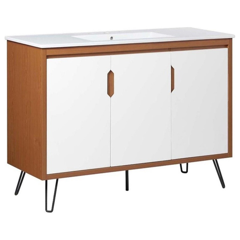Instill mid-century modern energy in your bathroom decor with the Energize 48" Bathroom Vanity. Resting on four metal hairpin legs, this bathroom vanity cabinet features a durable particleboard and MDF construction and a ceramic sink basin with 8-inch cent