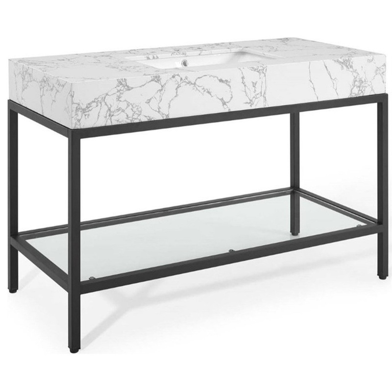 Channel opulence with the glam deco Kingsley Matte Black Stainless Steel Artificial Marble Bathroom Vanity. The Kingsley Bathroom Vanity introduces a royal style to your bathroom with the artificial marble curved basin and matte black metal accents. Resting on a black stainless steel frame, the Kingsley 8-Inch Centerset Bathroom Vanity features a modern glass shelf for storing all your bathroom essentials and rests on non-marking foot caps to protect flooring. Assembly required, fixtures not included.