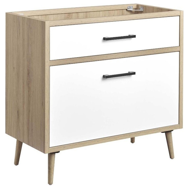 The Maverick 36″ bathroom vanity cabinet is the perfect blend of modern style and convenience. Crafted with particleboard and melamine, the simple yet elegant design is enhanced by modern metal handle pulls and tapered and splayed rubberwood legs. The spacious full-glide bottom drawer provides plenty of storage space for all your bathroom essentials, while the fixed top drawer adds complementing style. This bathroom vanity cabinet instantly transforms your space, creating a beautiful, modern look that will last for years. Includes non-marking foot glides to protect flooring. Assembly required. Fixtures and sink basin not included.