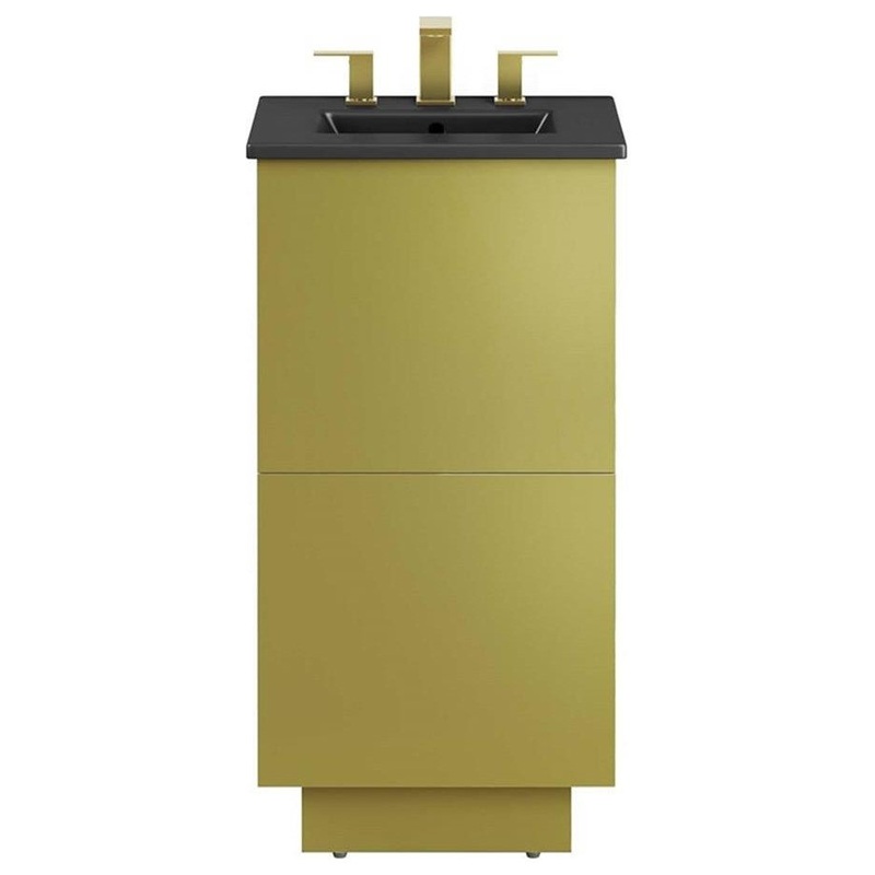Experience a harmonious blend of luxury and practicality with the Quantum 18″ Bathroom Vanity. This modern bathroom vanity features a sleek ceramic sink basin with 8″ centerset holes and integrated countertop, awaiting your personalized fixture choices (not included). Durably crafted from MDF and showcasing a refined gold finish, this vanity cabinet radiates sophistication. A spacious full-glide drawer offers ample storage for bathroom essentials, complementing the sleek design. Assembly is required, promising a rewarding setup for this functional, modern vanity.
