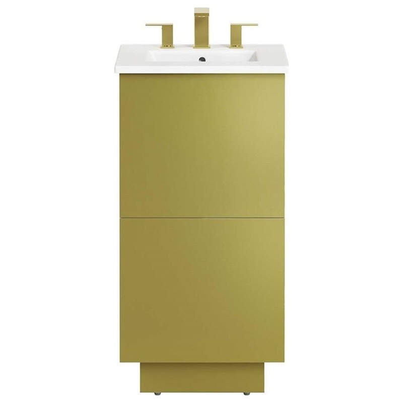 Experience a harmonious blend of luxury and practicality with the Quantum 18″ Bathroom Vanity. This modern bathroom vanity features a sleek ceramic sink basin with 8″ centerset holes and integrated countertop, awaiting your personalized fixture choices (not included). Durably crafted from MDF and showcasing a refined gold finish, this vanity cabinet radiates sophistication. A spacious full-glide drawer offers ample storage for bathroom essentials, complementing the sleek design. Assembly is required, promising a rewarding setup for this functional, modern vanity.