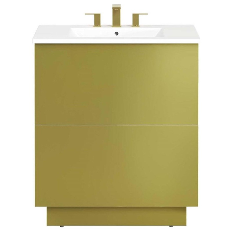 Experience a harmonious blend of luxury and practicality with the Quantum 30″ Bathroom Vanity. This modern bathroom vanity features a sleek ceramic sink basin with 8″ centerset holes and integrated countertop, awaiting your personalized fixture choices (not included). Durably crafted from MDF and showcasing a refined gold finish, this vanity cabinet radiates sophistication. A spacious full-glide drawer offers ample storage for bathroom essentials, complementing the sleek design. Assembly is required, promising a rewarding setup for this functional, modern vanity.