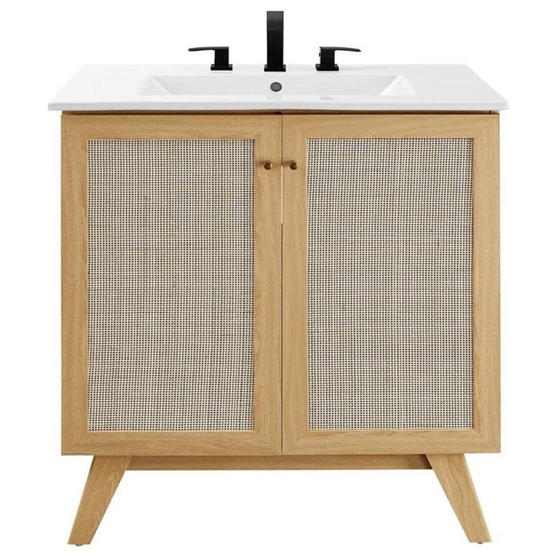 Introduce refreshing style to your restroom with the Soma 30″ Bathroom Vanity. Showcasing a beautiful rattan weave on the cupboard doors, this vanity brings organic aesthetics and modern functionality to any bathroom or powder room. Crafted from durable MDF and particleboard with a natural wood grain finish, this vanity boasts a ceramic sink basin with 8-inch centerset holes and an integrated countertop. This vanity features an adjustable shelf, providing easy customization for arranging towels, toiletries, and bathroom necessities. Complete with metal doorknobs with a brushed gold finish and soft-close hinges, this bathroom vanity cabinet is designed for quiet and effortless functionality. Resting on splayed legs, the Soma Bathroom Vanity includes non-marking foot caps to protect flooring. Assembly required. Fixtures not included.