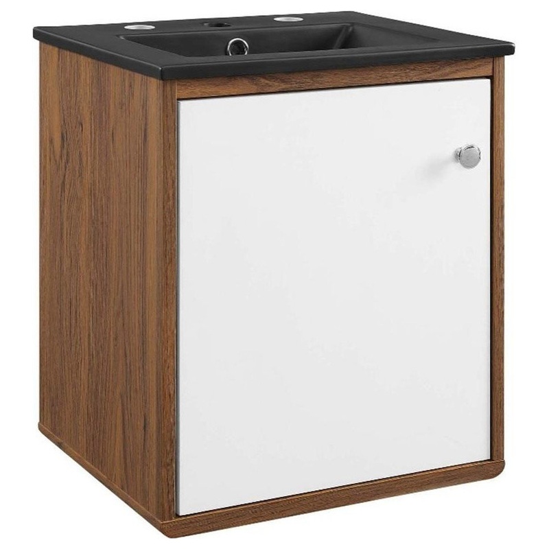 Bring mid-century modern aesthetics into the bathroom with the Transmit 18″ Bathroom Vanity. This vanity features a durable particleboard and walnut grain veneer construction with ample storage space for all your bathroom essentials behind a white lacquered soft-close hinged door. A ceramic sink with an integrated countertop, 8″ centerset faucet holes, and rectangular sink basin continues the sleek look of this retro modern vanity. Complete with chrome knobs, this bathroom vanity mounts directly to the wall saving a substantial amount of floor space. Assembly required and sink fixtures not included.