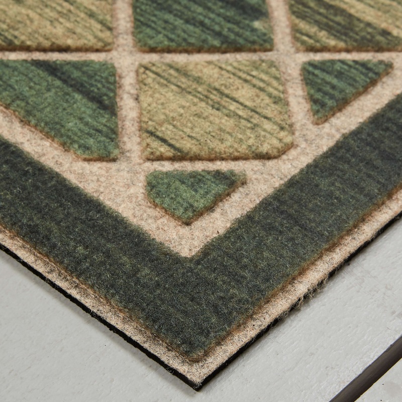 Mohawk Home’s Ornamental Woodgrain Entry Mat showcases a diamond lattice motif cast in dark hunter green and ash grey. This decorative doormat features a subtle textured surface that absorbs moisture and helps remove dirt and debris from your shoes. Low-profile height offers ideal functionality for high traffic areas and in entryways as it will not obstruct doors from opening or closing. This doormat offers low maintenance upkeep – simply vacuum, shake out, or sweep off debris, spot clean with a solution of mild detergent and water. Do not bleach. Air dry. Dry flat.