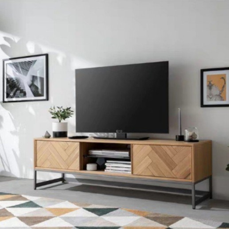 An industrial variation of our Herringbone TV console design, the Valor features the distinctive herringbone pattern in a wood stain of your choice, with an open shelving compartment for your media accessories and two sliding doors with wide storage space.