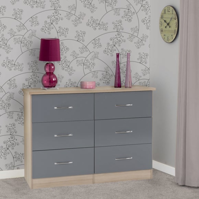 The Nevada 6 Drawer Chest features a contemporary design owing to the gloss finished front which contrasts perfectly with the metal handles. The Nevada has your storage needs covered thanks to the ample drawer space which sits on sturdy metal runners.Pleas
