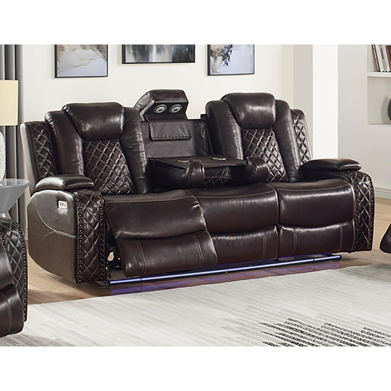 Joshua Collection by New Classic Furniture Dark Brown finish Crafted from hardwood and plywood Fabric Content: 100% Leather Dual reclining Storage arms Wireless charger Theater lighting Coil cushion KD wing Drop down center back dring tray with lift up lig