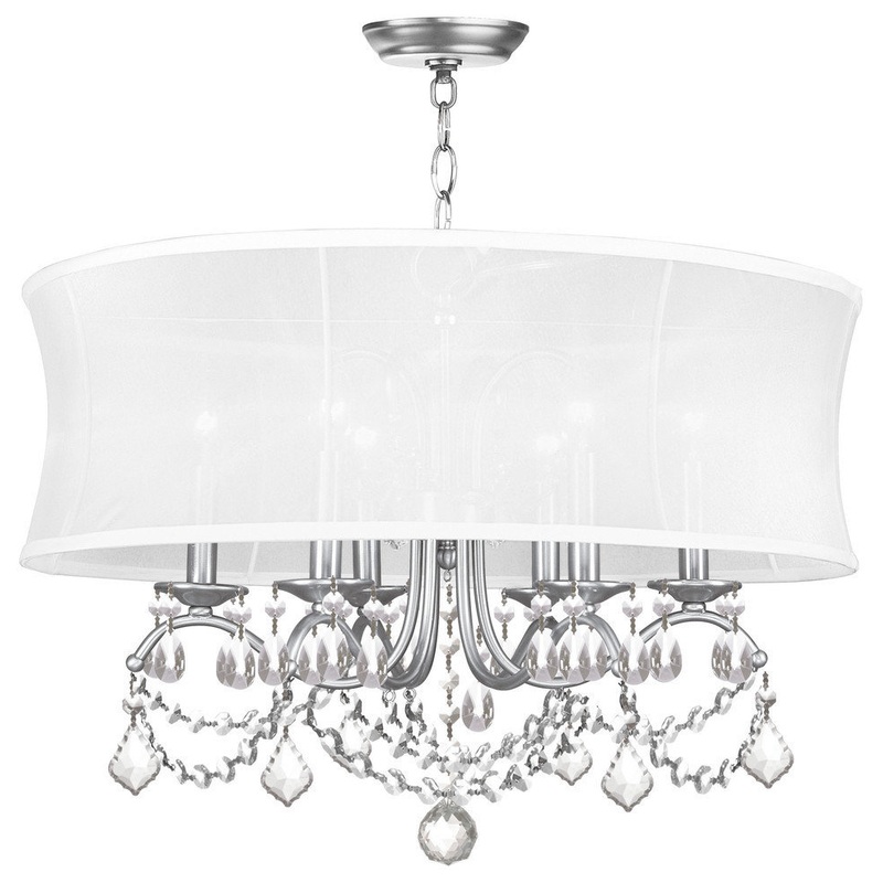 Add glamour to your home with this enchanting shaded chandelier. Scrolling arms adorned in a brushed nickel finish are paired with glittering crystal drops that reflect light when illuminated. A white handmade silk shimmer shade completes this chic design.