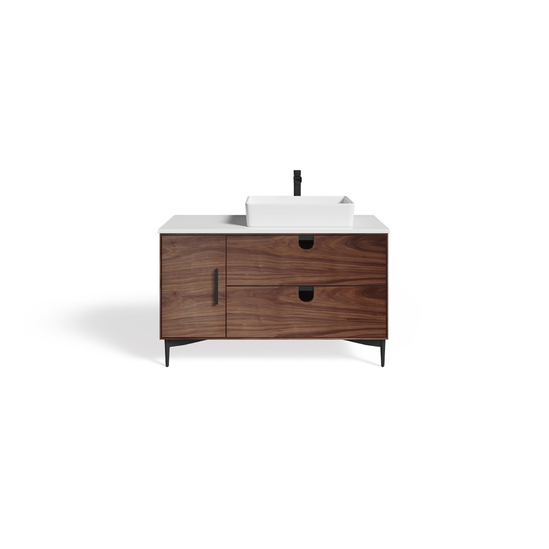 Mid-century minimalism gets a new-millennium upgrade in this vanity from MOD. The retro-styled walnut-look base takes on a contemporary twist with a ceramic vessel sink set atop pure white quartz. Soft-closing drawers and adjustable cabinets complete the functionality of this bold addition to your modern bathroom aesthetic. Make this vanity your own with the addition of faucets, mirror and lighting.
