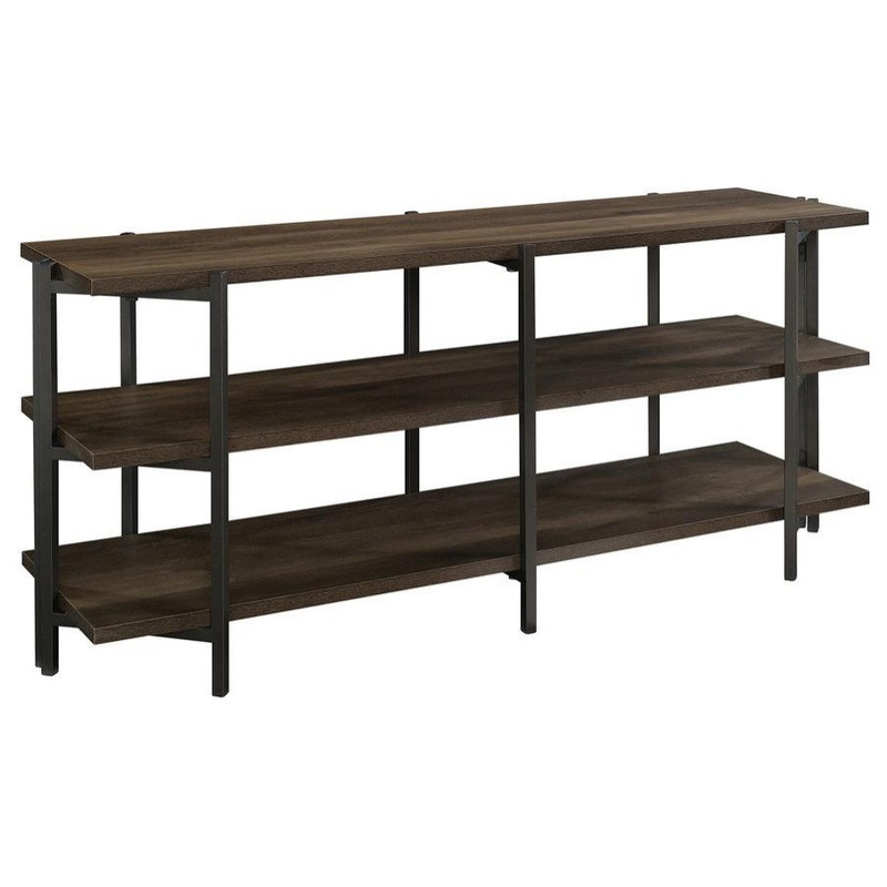 It’s time for an entertainment upgrade! Give your home the update that it needs without having to sacrifice on style with this credenza from the North Avenue collection. This TV credenza accommodates up to a 55 TV, making it ideal for binge watching your favorite shows or playing endless hours of video games with your friends. This TV stand features sturdy 1 thick top and shelves. Already have a TV stand? Use its spacious top surface to display home dcor items like decorative plants and photos of your family and friends. Its two lower shelves are ideal for your video and gaming equipment or storing items like organizing bins and your collection of movies. Its durable, black metal frame ensures that it’s sturdy and built to last. This entertainment credenza is finished on all sides for versatile placement throughout any room in your home. Finished in Smoked Oak, this attractive credenza is just what your home is missing.