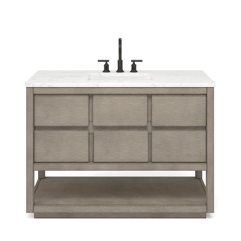 The simple and streamline design makes your bathroom more elegant. Featuring ample storage drawers, the Oakman vanity by Water Creation will be a useful addition to a large bathroom or a small powder room. Dressed to impress with wood grain surface embellishments, this vanity set is such a brilliant choice for rooms with rustic scheme. Grey Oak finish will give the classic styling with aesthetic influence. Combined with Carrara white marble top, the elegantly crafted drawers, and open shelf all give substance to the durability and superior craftsmanship which last a lifetime.