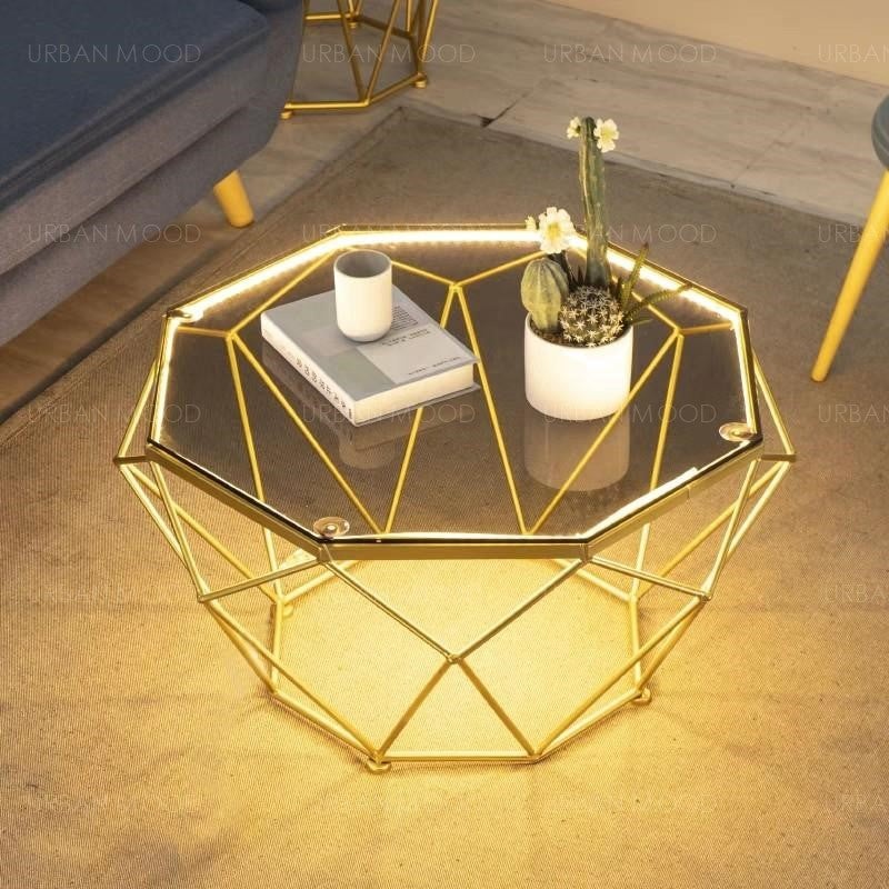 A stunning LED lit glass table with contemporary open wire framework in gold.Designs: Clear glass top; Black tinted glass top; Opaque black glass top; Opaque white glass top; White marble top (+$50); Black marble top (+50)