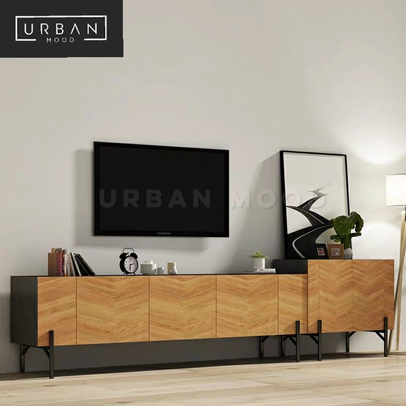 Let the rustic beauty of the Oliver TV stand take focal point in your living room. A contemporary take on the well-loved Chevron wood pattern, this TV cabinet is crafted from solid pine wood and features four enclosed cabinets and media management ports to