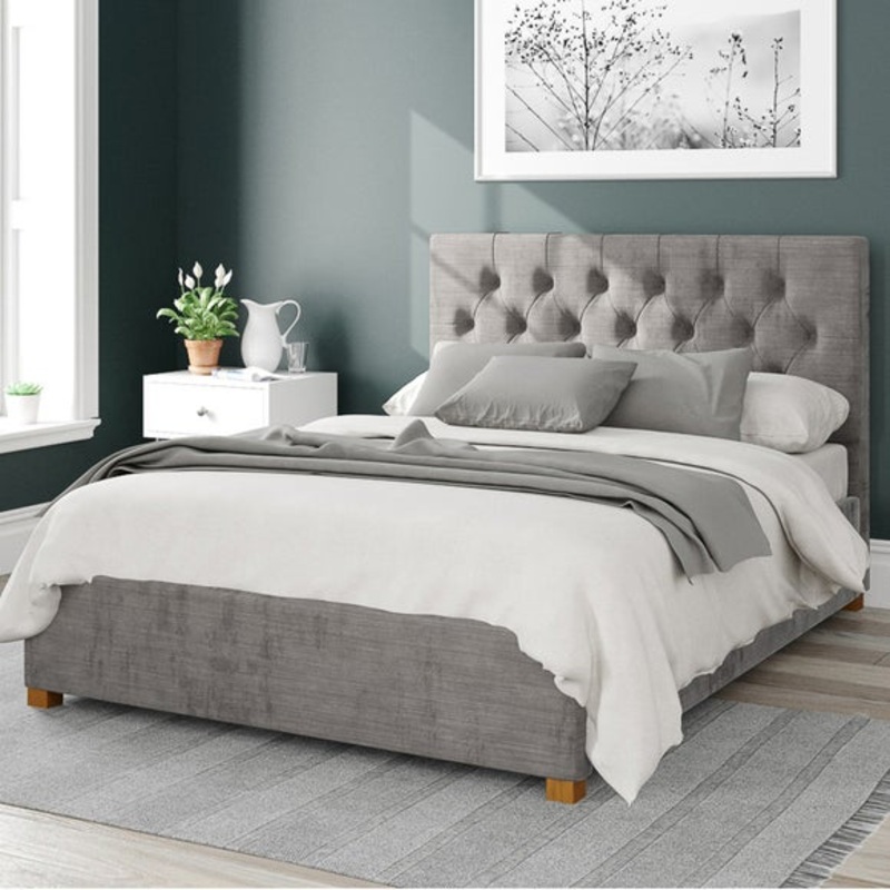 Velour fabric ottoman bedDeep buttoned headboard designTimeless Olivier rangeHand upholstered with deep paddingLarge storage area with fabric dust protection sheetHands free access to storage (mattresses up to 60kg) - mattress not includedSolid hardwood fe